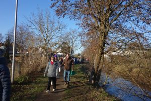 Die 1,5-stündige Wanderung führte bei herrlichem Winterwetter und blauem Himmel vom Alten Rathaus durch den historischen Ortskern, entlang des Waldwiesengrabens, durch Feld, Wald und Flur. Ein Highlight war der Anblick der überschwemmten Wiesen, wo sich Störche, Enten und Nilgänse tummelten.